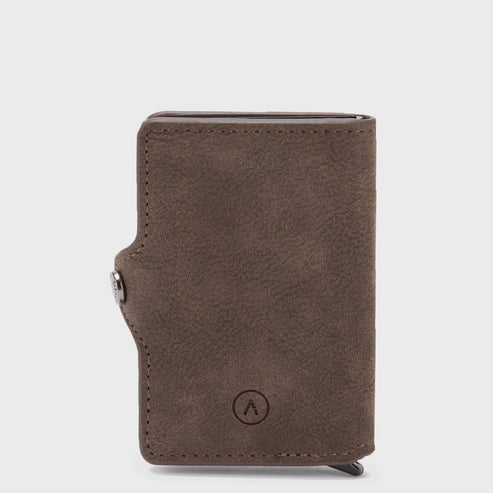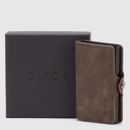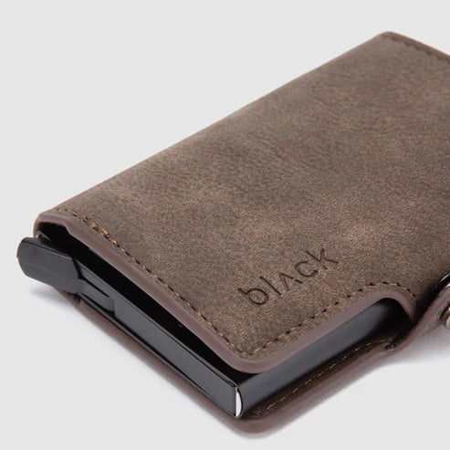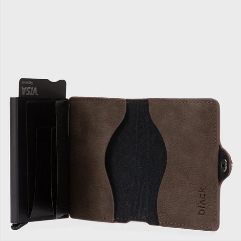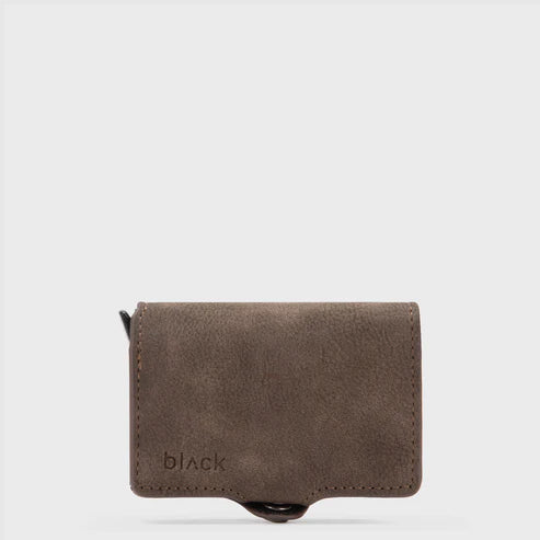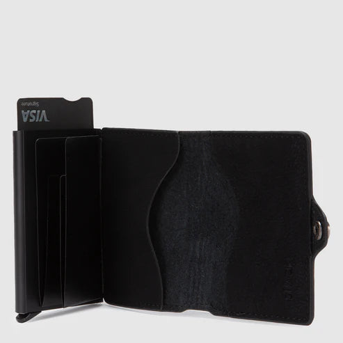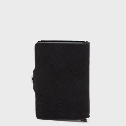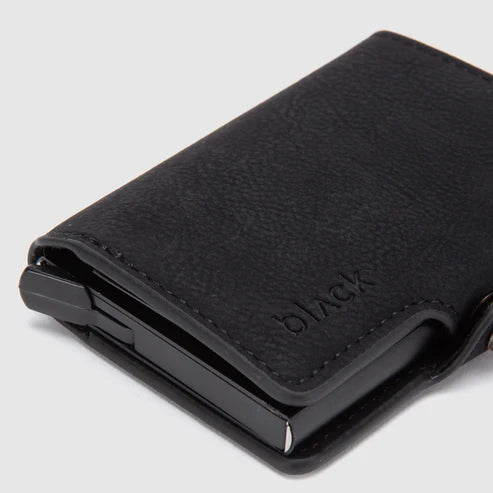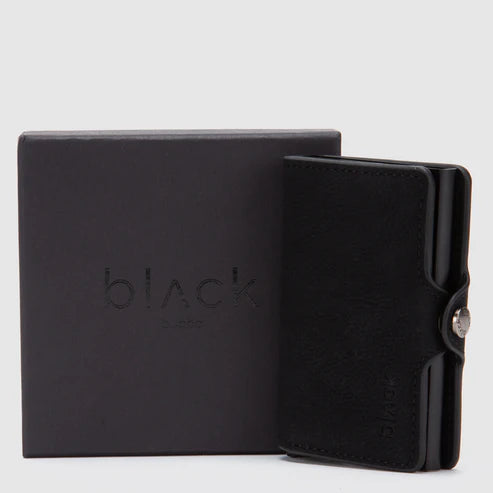 La clásica billetera smart de Black, ahora en nuevo material con efecto cuero. Diseñada principalmente para tarjetas: presiona el botón inferior y deslízalas fácilmente. Compacta, funcional e ideal para llevar en cualquier bolsillo. En su interior puedes guardar billetes y tu carnet, todo en un solo lugar.