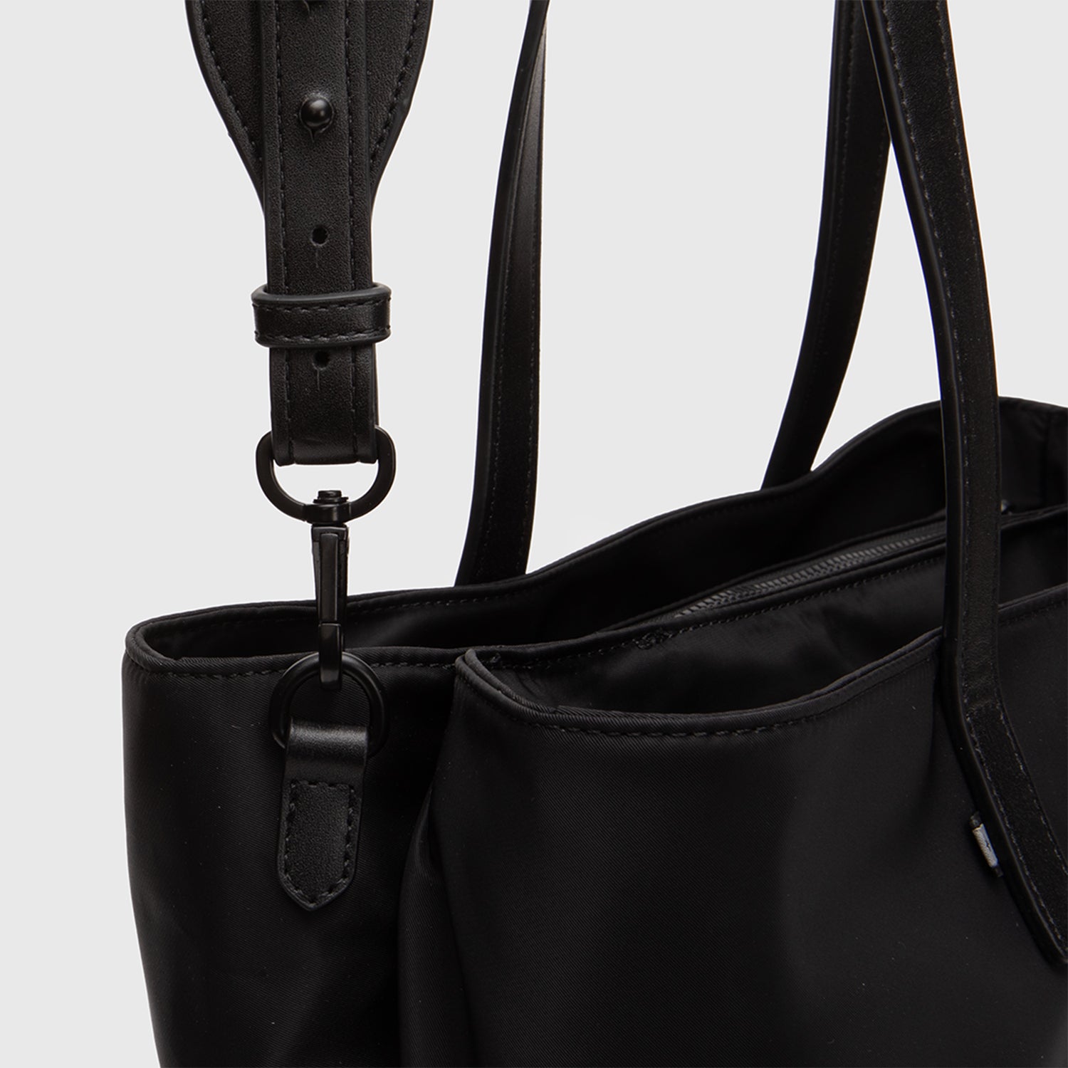 Tote funcional y versátil, confeccionado en 100% nylon tanto en su exterior como interior. Cuenta con dos bolsillos frontales de acceso rápido: uno con cierre y otro diseñado para abrirse y enganchar el tote a la asa de la maleta, ideal para viajar. En su interior incorpora dos amplios compartimientos principales, un bolsillo pequeño de rápido acceso para celular o billetera, un compartimiento elasticado para botellas, un gancho para llaves y un bolsillo interior con cierre. Perfecto para la ciudad, la oficina o viajes, combinando organización, comodidad y estilo.